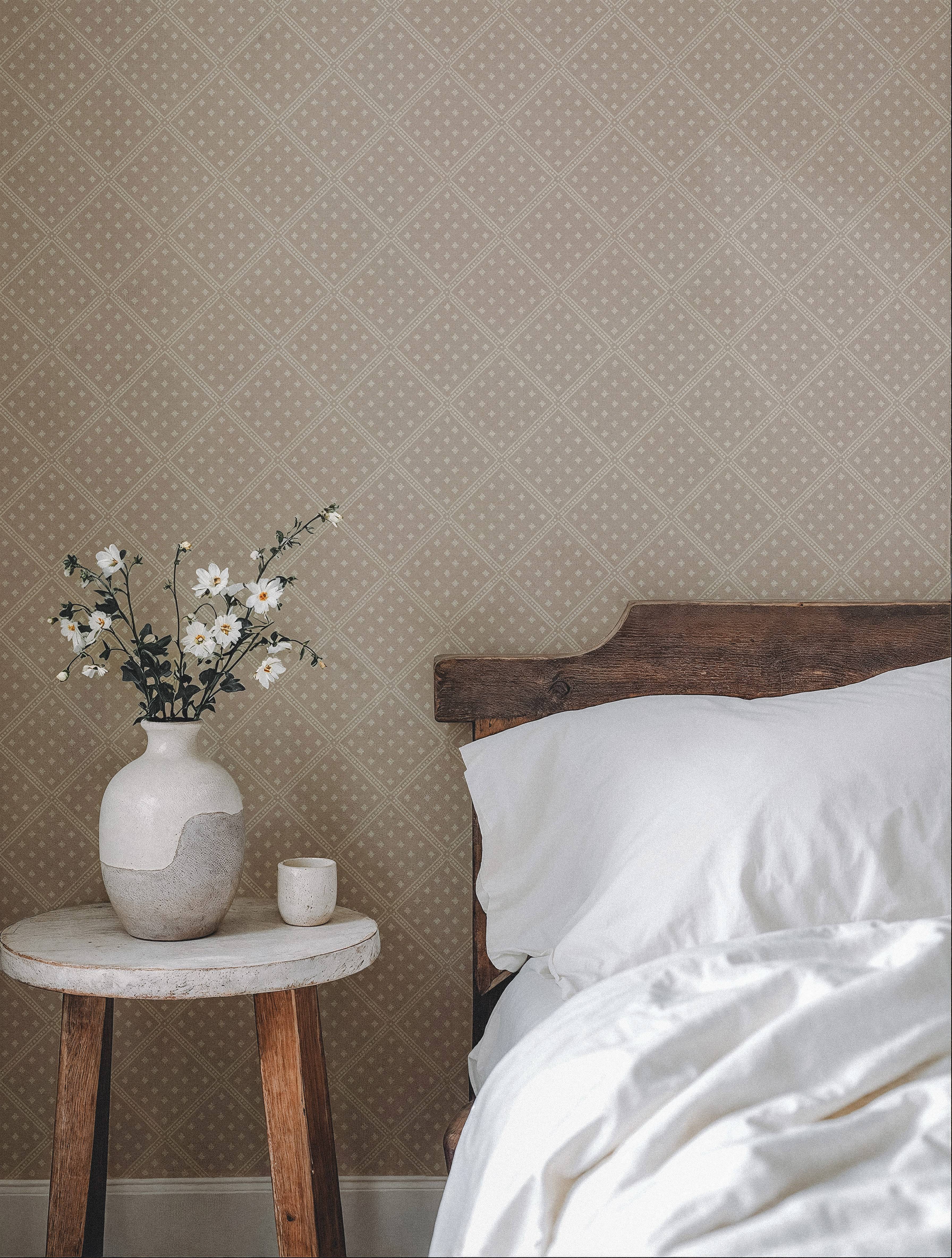 Med en sofistikerad färgskala i dämpade taupenyanser simulerar denna tapet traditionella blocktryckstekniker och fångar den subtila elegansen från svensk allmogetextil. Mönstret består av ett finstämt, småskaligt rutnät med stiliserade klövermotiv, vilket skapar ett lugnt rytmiskt uttryck.